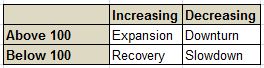 To model the state of the global business cycle we use OECD`s Leading Indicator that is cyclically adjusted. We define one of four states based on whether the series is above or below 100 and if it increased or decreased in the month. The definitions are stated below in a tabular format: