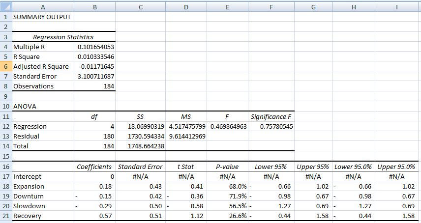 We can then run a regression procedure with Y equal to the monthly returns and Xs being the business cycle states.