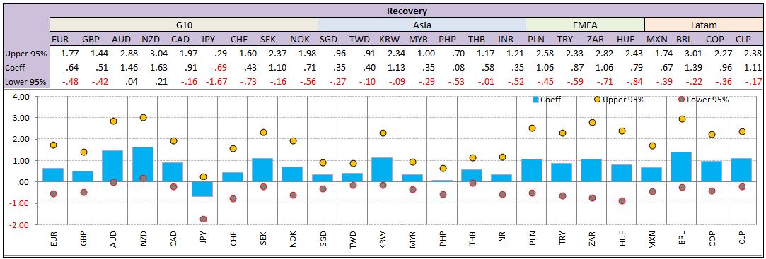 In the case of Recovery state we can see that AUD, NZD, CAD, SEK, TWD, KRW, THB, and BRL have strong returns while JPY typically depreciates.