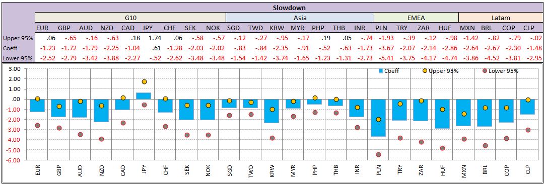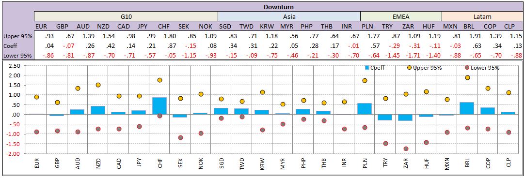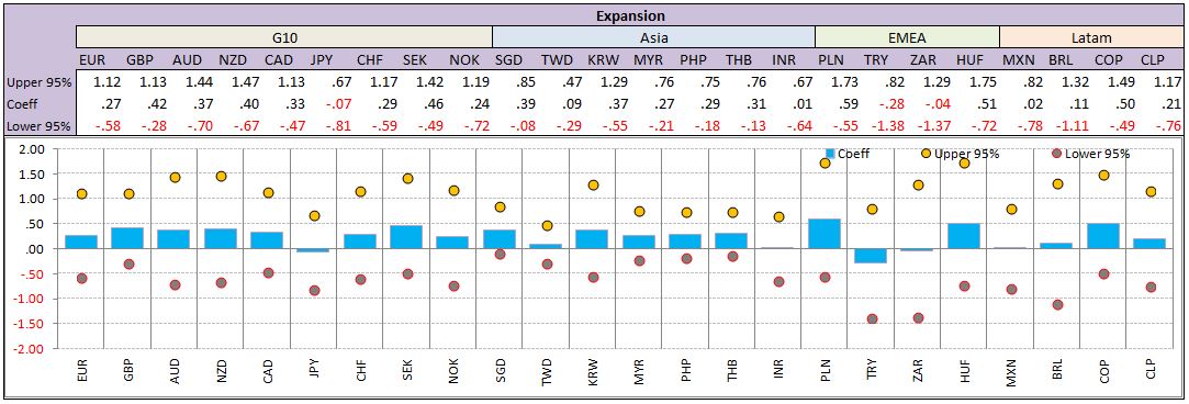 We can repeat this exercise for a selected list of securities. Below we check FX spot returns (excluding carry) for a list of currencies measured against USD for the last 12 years. We plot the coefficients and +/- 95% confidence levels to spot statistically significant returns. The results reveal strongest results for Recovery and Slowdown states.