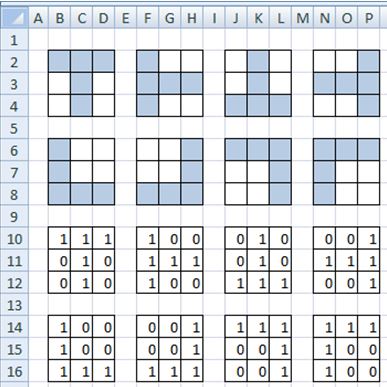 The top four figures represent the letter T while the bottom four represent the letter L. Now, to give these patterns to a neural network we need to put numbers to the patters. A logical way is to assign the number 1 to a cell in a pattern if it is shaded and 0 otherwise. Each cell will represent an input node in our neural network. Below is how we can represent each pattern with a combination of 1s and 0s.