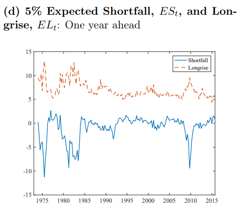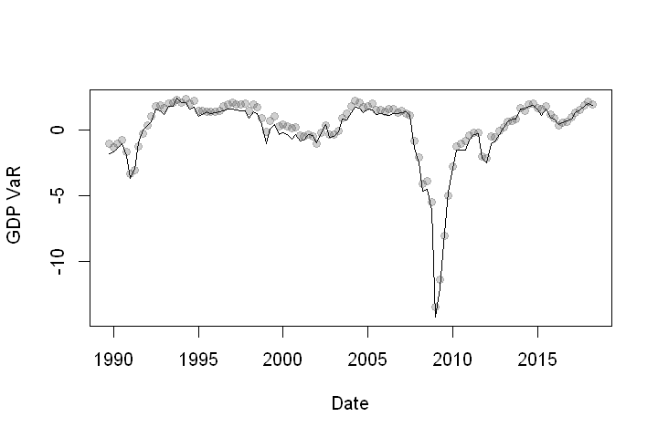 - Once we have a full fitted distribution, we can calculate expected shortfall for GDP. We can then monitor the evolution of GDP tails risk conditional on current growth and financial conditions.