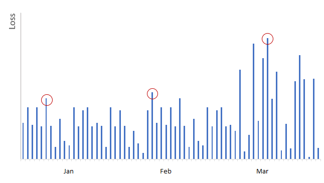 We now know that we want to fit a GEV distribution to some data set. The issue is how to do it. We are trying to model maxima so lets try the following. Lets take some historical data, break it into k blocks, and look at the maximum value in each block and consider that to be our sampled value that we are trying to model. Lets assume we are working with a financial time series and we are looking at daily returns. Furthermore assume we are trying to model loss distribution so we will look at only negative returns on a daily basis. Below is a stylized chart assuming looking at only losses (represented as positive values). We are looking at 3 months worth of data. We can break the data set into monthly blocks and take measure the maximum in each month. We highlight the three observations below in red. The three observations would be used to fit the GEV distribution.