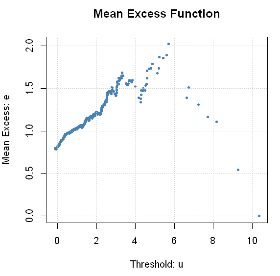 Finally, a quick note on how to select the threshold u. This is more of an art than science. A common approach relies on Mean Excess Plots. The idea here is that for GPD, the mean excess value is a linear function of the threshold.